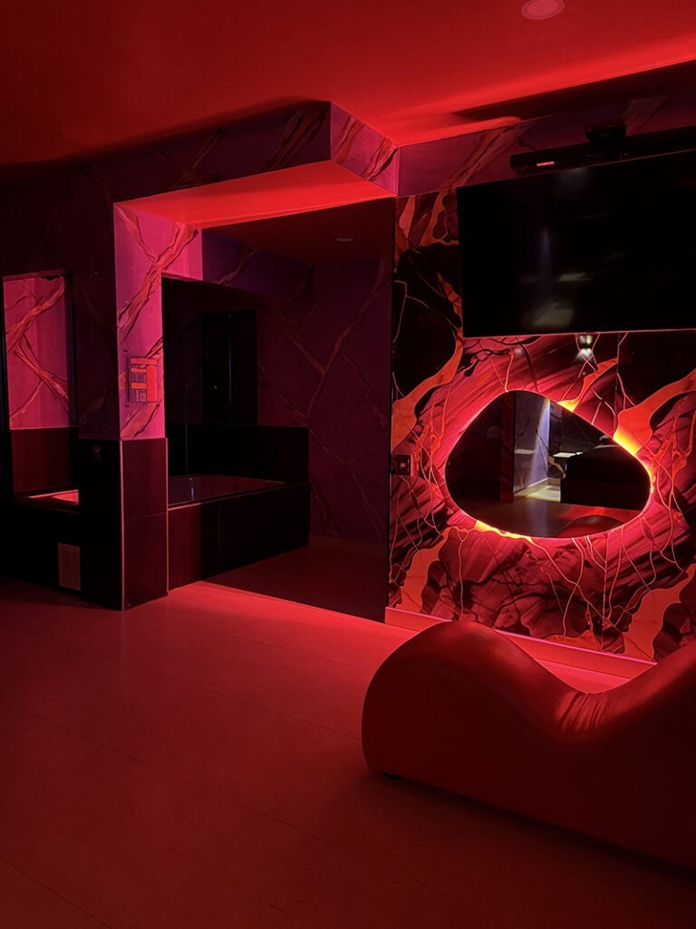 Si has leído o visto «50 Sombras de Grey», ya tienes una idea de lo que esta suite tiene para ofrecer. La Suite 59 está diseñada para aquellos que desean vivir sus fantasías con un toque de lujo y sofisticación. Con sus luces rojas, espejo flotante y amarres, esta suite es el escenario perfecto para explorar el bondage, la dominación y la sumisión.